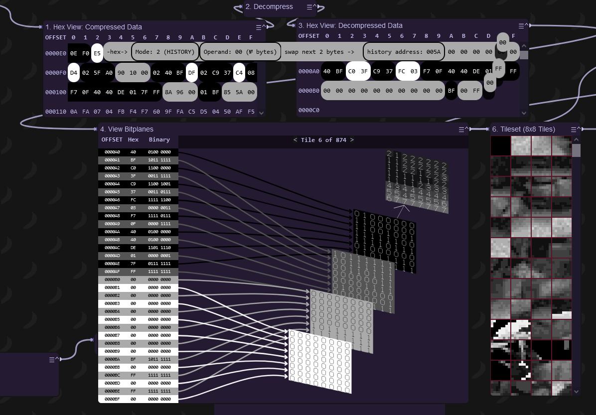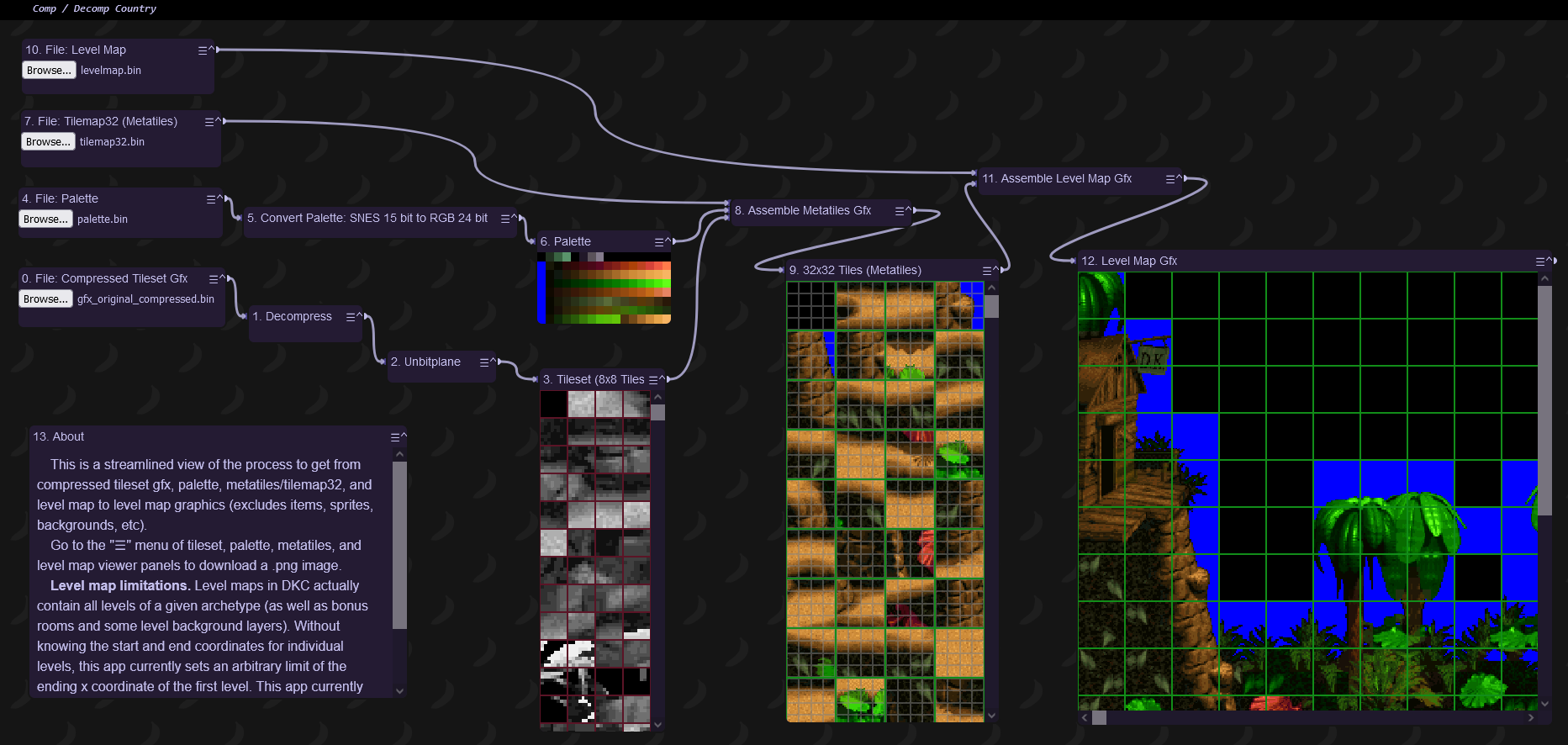 The app can compress and decompress SNES 4 BPP tilesets using DKC's custom compression scheme. It provides an interactive 3D model of bitplanes and the resulting indexed color matrix. And it lets users download palettes, tiles, and level maps (with limitations).